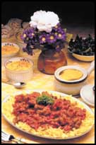نعرض هنا نموذجين لصالتي تناول الطعام، و فيما تعكس الاولى الطابع الذهبي وتأخذ طابعا أقل رسمية اذ هي للعائلة تبين الثانية طابعا اكثر وقارا وكلاسيكية مع فخامة من خلال اعمال الخشب الدقيقة المتقنة وتغدو اكثر رسمية وتناسب استقبال الضيوف والولائم والمناسبات.