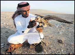 شاب قطري من هواة الصيد وتربية الصقور يقدم لحم الحمام لصقر ثمين وذلك مكافأة له على إتمام كل مراحل التدريب الشاقة ليصبح عضواً جديداً بين صقور الصيد التي يفخر أصحابها بامتلاكها من أجل ممارسة رياضة عريقة نعتز بها كعرب.