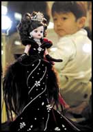 طفلة يابانية صغيرة تستمتع بمشاهدة نسخة خاصة من الدمية اليابانية الشهيرة المسماة «ليكا شان» والتي ظهرت لأول مرة في الستينيات لتكون حلا يابانيا ذكيا لإبعاد الدمية باربي ذات الطابع الغربي والتي بدأت في الإنتشار باليابان في ذلك الوقت.. هذه الدمية ظهرت أمام زوار معرض تاكارا الشهير للالعاب وقد تزينت بفستان جميل مرصع بـ881 قطعة من الألماس وبسعر إجمالي يبلغ 826 ألف دولار أمريكي لكنها ليست للبيع ........